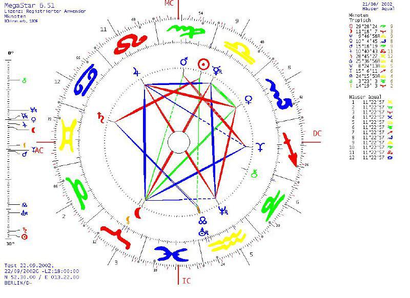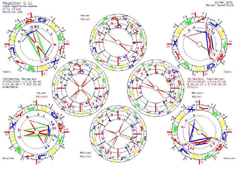 Ausdruck des Mondknoten-Horoskopes - wahlweise quer oder hoch. Dazu gehören: eine Aspektmatrix und die Aspektfiguren und ein Berechungsformular.
